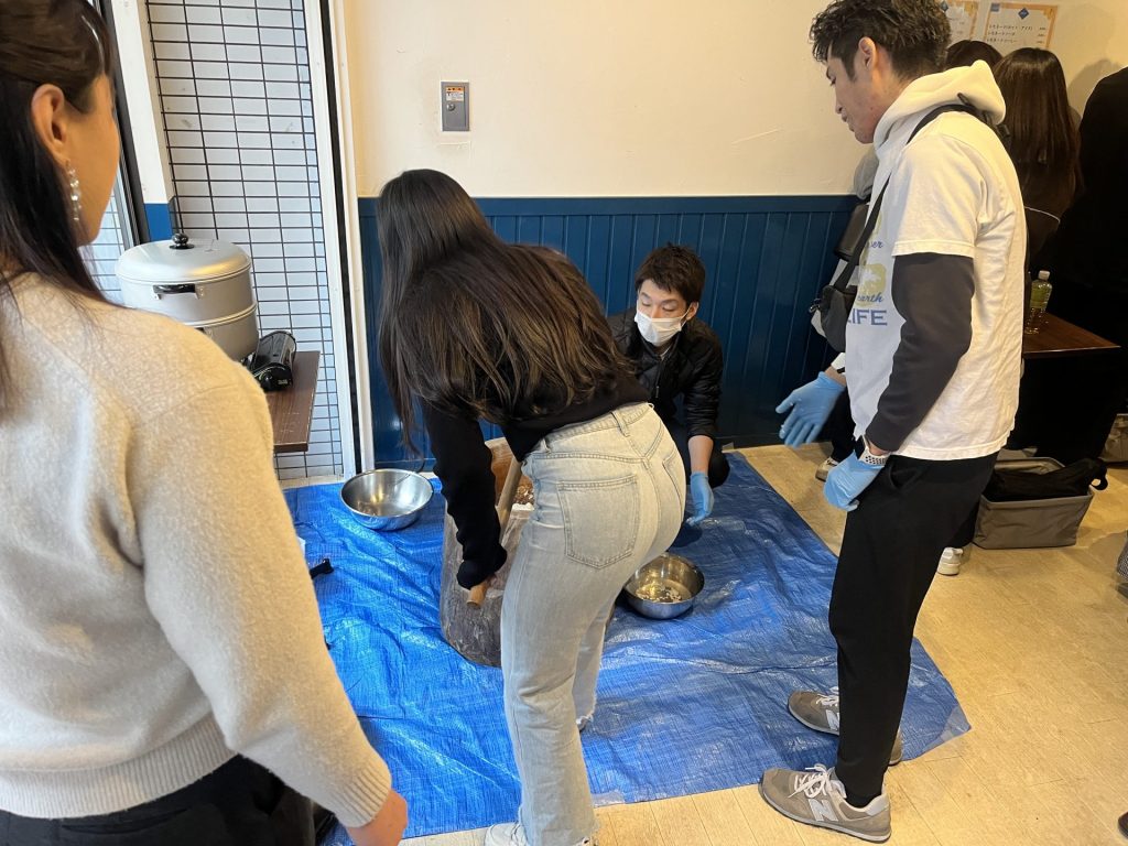 もちつき大会は、1日に2回の開催で、どの回もお店の中に収まりきらないくらい大勢のお客様に参加いただきました。